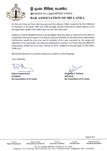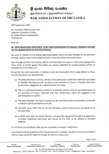 මෝටර් රථවල ඉදිරි වීදුරුව මත ප්රදර්ශනය කරන නීතිඥවරුන් හඳුනා ගැනීමේ වාහන අවසරපත් (Lawyers’ Car Passes) අවලංගු කිරීමට අදාල සිද්ධිය සම්බන්ධයෙන් ශ්රී ලංකා නීතිඥ සංගමය (BASL) විසින් පොලිස්පතිවරයා වෙත ලිපියක් යොමු කරමින් සිය ස්ථාවරය පැහැදිලි කර තිබෙනවා.